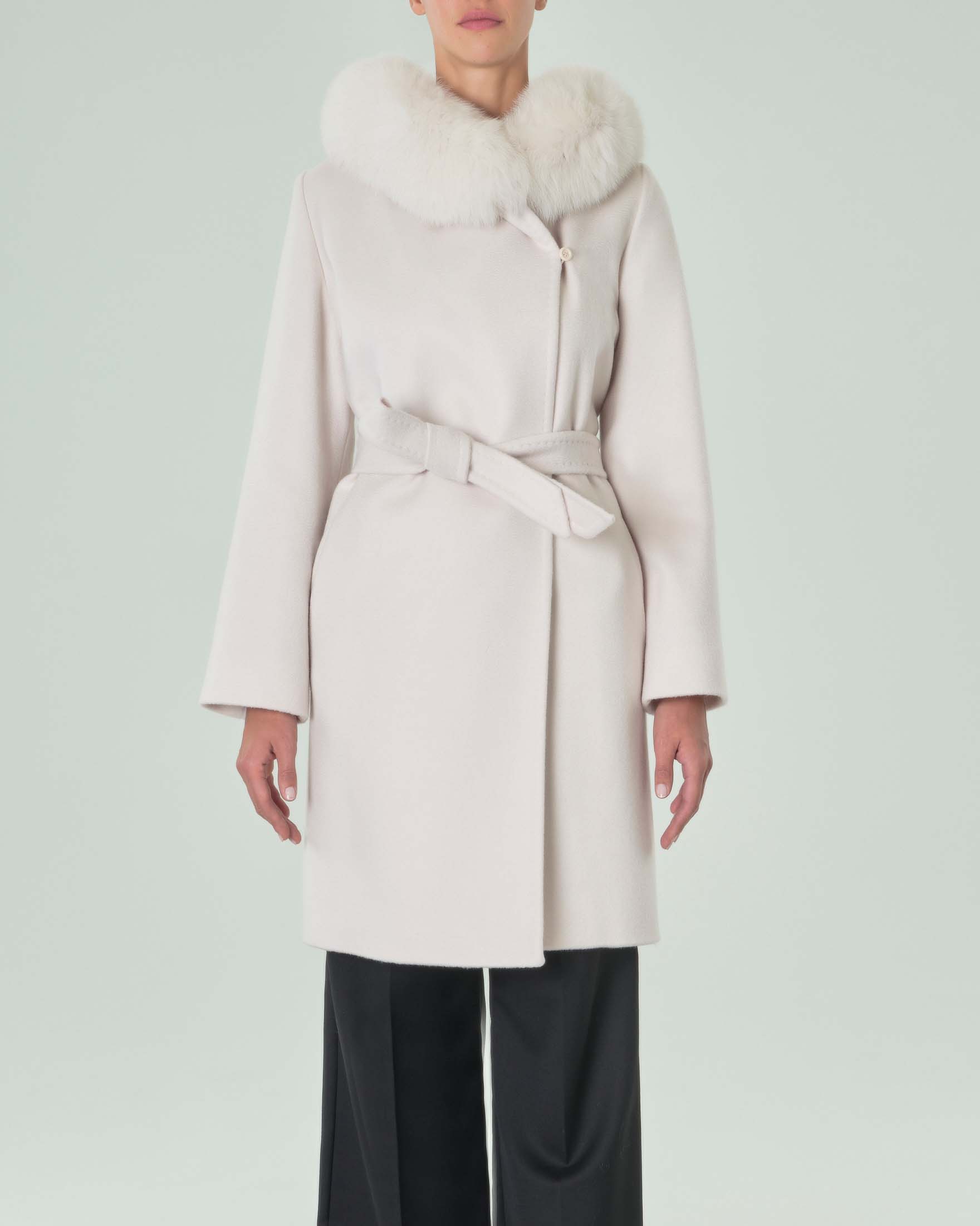 Cappotto color sabbia in pura lana con cintura in vita e cappuccio profilato in pelliccia di volpe Very well made.