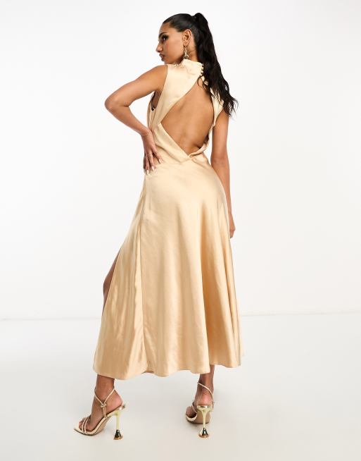 ASOS DESIGN high neck midi dress with drape detail in gold Very well made.
