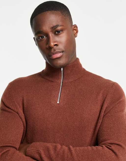 ASOS DESIGN knitted ribbed half zip jumper with colour block chest stripes in tan Very well made.