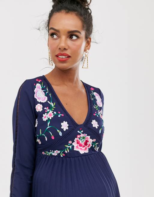 ASOS Maternity ASOS DESIGN Maternity embroidered pleated midi dress with lace inserts in navy ShopStyle Very well made.